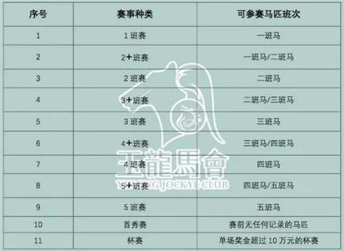 玉龙马会联合新加坡马会共同按照国际标准,邀请国际优秀、专业的评分师对所有参赛马匹进行统一评分,根据评分结果将所有参赛马匹分为五个班次,分别为:一班、二班、三班、四班、五班;其中一班为最高,五班为最低。每一赛事日结束后,根据参赛马匹的成绩对评分进行相应调整,如达到调班标准,则进行班次调整。
