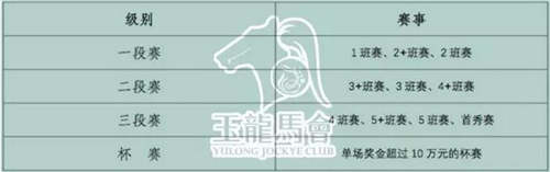 四种级别:为便于年度马主、马匹、骑师、练马师的积分统计和排名需要,将十一种赛事分为一段赛、二段赛、三段赛和杯赛。