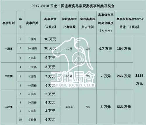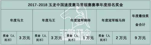玉龙中国速度赛马2017~2018赛事年度常规赛总奖金规模为1200万元,其中包括:玉龙常规赛奖金,骑师、练马师专项奖金,年度排名奖金。