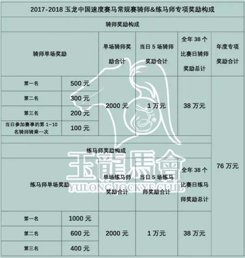 玉龙马会在玉龙中国速度赛马常规赛中还为骑师、练马师设立了专项奖励,骑师单场每骑乘一次奖励100元、骑师、练马师单场比赛获得前三名会有不等的专项奖励(见下表)。