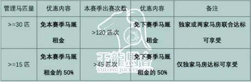 为了让当今中国马业的众多参与者更实惠地享受常规赛,特别制定了2017~2018年度赛场马厩租赁优惠政策,详细内容如下表: