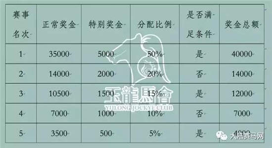 凡满足上述两项条件的参赛马匹,在玉龙常规赛6月份的单场比赛中,除原定赛事奖金按照管理办法进行分配外,增设的1万元特别奖金以相同比例奖励给前五名。以一场三班赛举例如下: